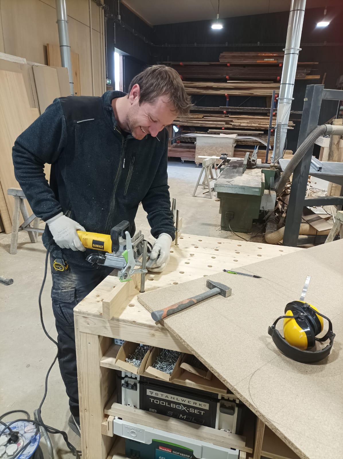 En 2021, Anthony rejoint l’atelier. Ensemble, ils poursuivent l’aventure à quatre mains, dans un bâtiment conçu par Antoine et équipé d’outillages professionnels de production, au service d’une menuiserie de précision et de caractère.